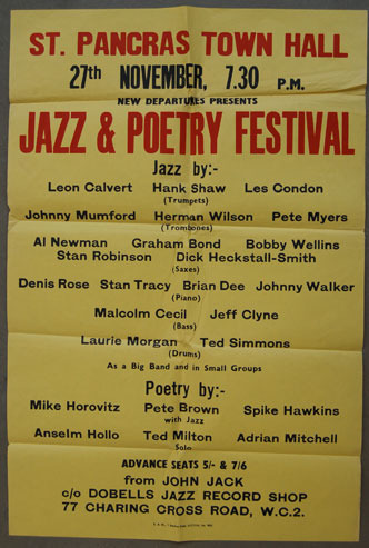 The CHELSEA space exhibition Dobells Jazz Folk Blues includes a bold 1961 poster for a Jazz & Poetry event including a listing for a reading by Mike Horovitz.