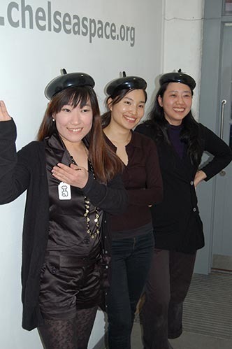 Gyeyeon Park, Daeun Jeong, and Su Jin Lee wearing rubber berets by Flora McLean at CHELSEA space in 2010