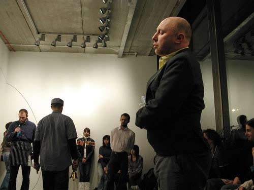 Pavel Pyś in discussion with Liz Peebles and Markus Eisenmann beneath a projection SECONDEDITIONS 'Qualified Nouns' 2002