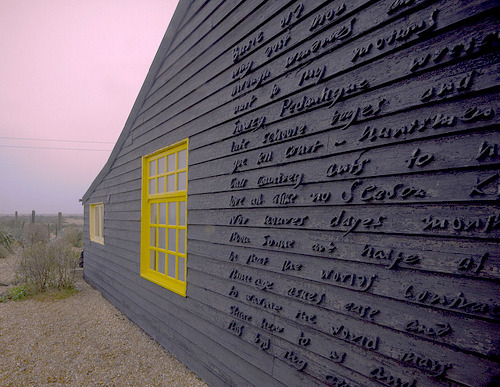 Derek Jarman's Prospect Cottage, Dungeness, Kent with John Donne's poem The Sun Rising originally installed by Peter Fillingham and later restored by Charlotte Moth