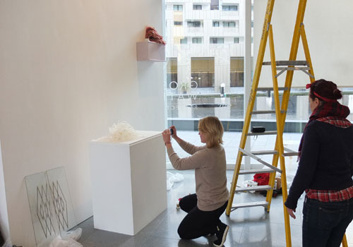artist Charlotte Jonerheim and curator Kate Ross during the installation of Surface at Chelsea Futurespace