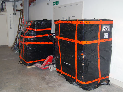 The silver/grey Medion Monitors that Sturtevant specified for her video installation have arrived from Berlin.