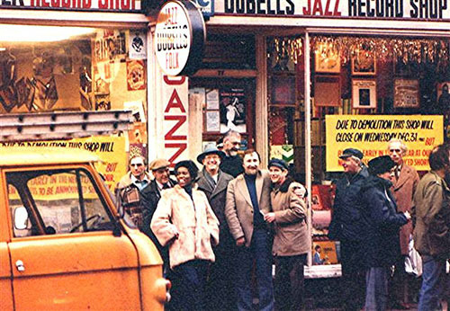 Gail Thompson, John Chilton, Doug Sollash, Brian Peerless, Bill Colyer outside of Dobells at 77 Charing Cross Road just prior to its closure for demolition in late 1980