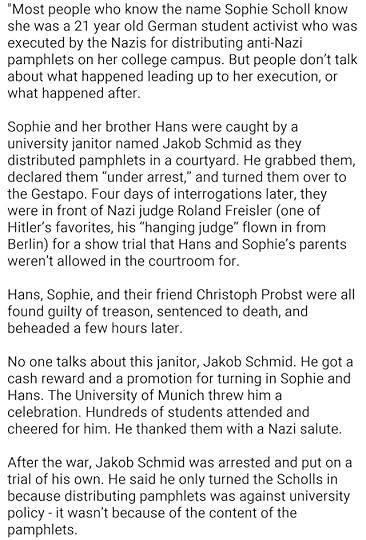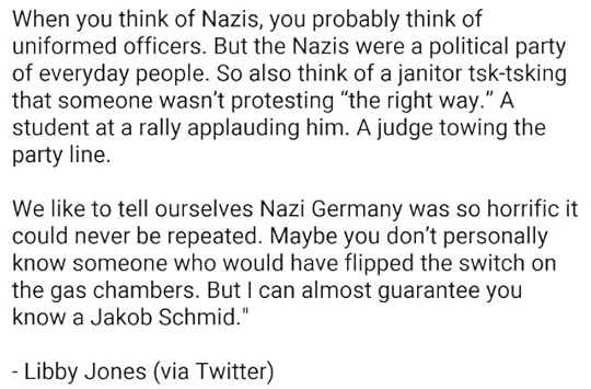 We can’t all be Irena. I couldn’t be Irena. She was in a unique place with very specific skills and connections that let her do what she did. I am just one mentally ill librarian. I can’t be her. But - I can be the bus driver. Or I could be the janitor. Because it doesn’t matter what your job is. It doesn’t matter who you are. In a world like this, every single one of us has the opportunity to do massive harm or massive good. We can save lives or end them.