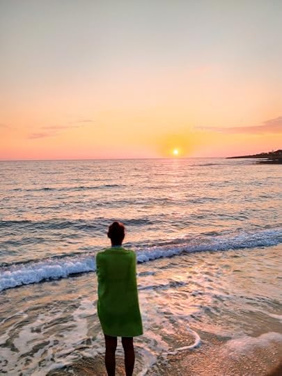 Coming out of the bathroom in my swimsuit, skin smelling of sunblock. M tells me I’m beautiful. Outside, the heat steals my breath. I swim from the buoys to the beach, clear, emerald waters cooling my skin.