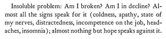 [ID: Insoluble problem: Am I broken? Am I in decline? Almost all the signs speak for it (coldness, apathy, state of my nerves, distractedness, incompetence on the job, headaches, insomnia); almost nothing but hope speaks against it. End ID]