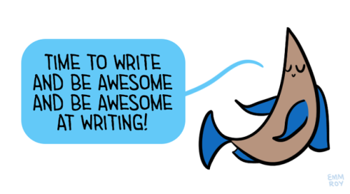 [Drawing of a brown fish with blue fins saying “Time to write and be awesome and be awesome at writing!” in a blue speech bubble.]