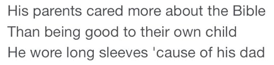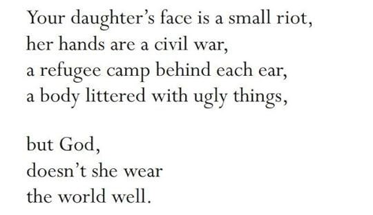 [text ID: Your daughter’s face is a small riot, / her hands are a civil war, / a refugee camp behind each ear, / a body littered with ugly things, / but God, / doesn’t she wear / the world well.]