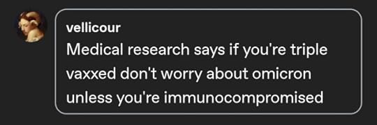 And yet EVERYONE I talk to is completely ignoring this and calling omicron more mild than previous strains, that it’s comparable to the flu (never mind that the science says it’s about twice as likely that you’ll have long lasting symptoms from covid than the flu). It makes me feel like I’m losing my mind. But we’re not losing our minds. Especially if you’re disabled/chronically ill, getting covid could be devastating even with a “mild” infection. My brain doesn’t know how to process all of this. The wide spread scale at which people are saying “fuck you” to disabled lives makes me want to vomit.