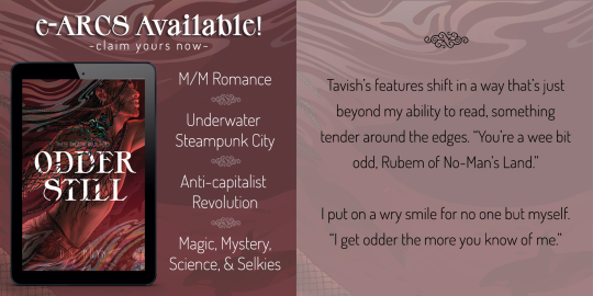 Odder Still is a M/M fantasy novel with a biracial and class-crossing slow burn romance, murderous intrigue, and a Marvel’s Venom-style parasite-human relationship in an underwater steampunk city. It is the first in a series, each with a romantically fulfilling ending and a final HEA, with steamy thoughts and foreplay but no explicit sex. (Content warnings for alcohol consumption and animal death.)