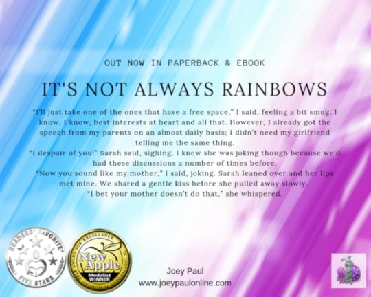 [ID: A dark room background with the title IT’S NOT ALWAYS RAINBOWS at the top and Out now in ebook and paperback just above it. The except reads: