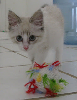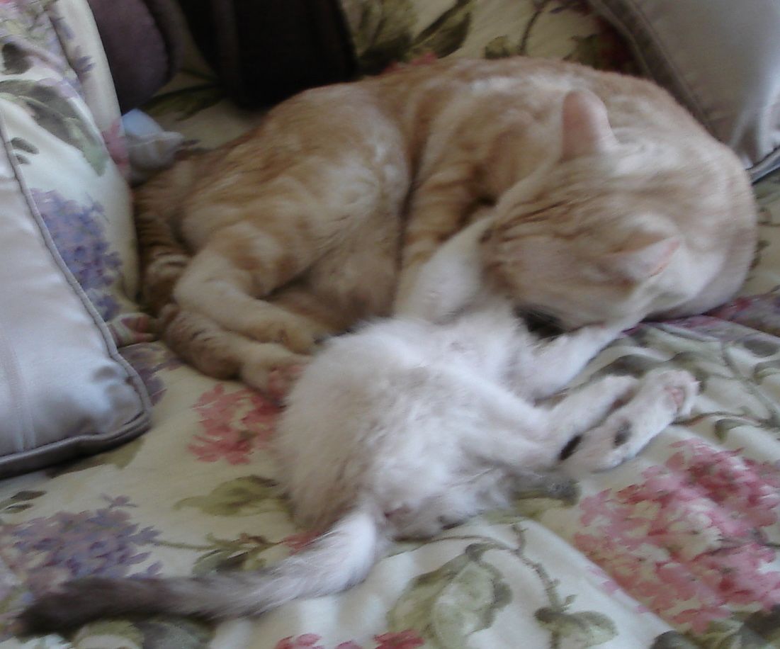 Now Sweet Pea is five years old and a much loved member of our family. Some aspects of the Rabid Badger remain. Unasked for petting can lead to a light bite. (She did a star turn in my trailer for my "Purr Therapy" book by biting on cue in the role of the least likely candidate for becoming a therapy cat.) The other cats find her volatility fascinating. Hamish, our three-year-old flame point Siamese, will simply sit in front of her and stare, without any signs of overt hostility, and watch her go into a paroxysm of hissing, spitting, thrashing rage. Minutes later, they're cuddling up together.