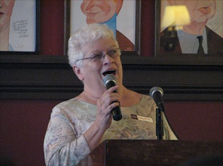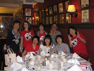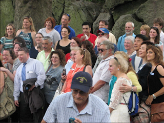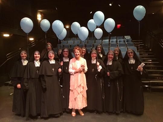 I told Mary that I was especially surprised to see her because she had just spent the week in New York where there was a trial run of a play based on her father's popular novel "Mr. Blue." Mary had been asked to provide a prelude/commentary to the play at each performance that week, a task she carried off wonderfully. Audience members -- like the group of nuns pictured below -- sought her out after each show with praise and with questions about her father -- Myles Connolly -- and his life and work.