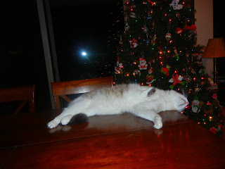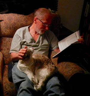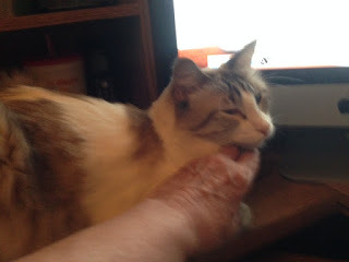And, in time, she became less hostile and anxious. She began to crave proximity to her people -- following us from room to room, wanting to be wherever we were, sitting beside me as I typed on the computer, her head resting on my left hand. As more time passed, she became friendlier with the other cats and sought petting from us at times of her choosing. She started cuddling beside me as I sat on the couch reading newspapers and spent hours in Bob's lap, not wanting to be touched too much, but yearning to be close. We found that she loved to have her picture taken, often jumping up to get into a photo, striking a dramatic pose.