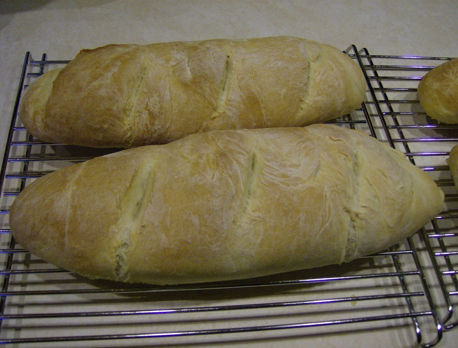 So today I baked four loaves of French bread so I could freeze two and we could finish up the week with crusty, fresh bread. French bread is one of the easiest breads to make: the list of ingredients is very short (basically flour, yeast, water, shortening, salt and sugar for the yeast to eat) and it bakes very quickly. The only tricky thing is getting a good crust, which you do by spritzing the bread with water and having a pan of water in the oven during the first 15 minutes of baking.My tip for French bread, though, is to get one of those foil lasagna pans and use that for your water reservoir in the oven (you can put it on a cookie sheet to stabilize it). The reason? If you make a lot of French bread, over time, any pan you use to hold the water will build up a white crust as the water evaporates out of the pan during baking. This is ugly and can be difficult to remove, so I just keep a foil pan that I use over and over again. While it has built up white scale, that's fine with me since this is all I use it for and when it gets too yucky, I'll use it in the garden to hold paper pots of seedlings. When it won't work for that any longer, well, I guess it can make the final trip to the dumpster.