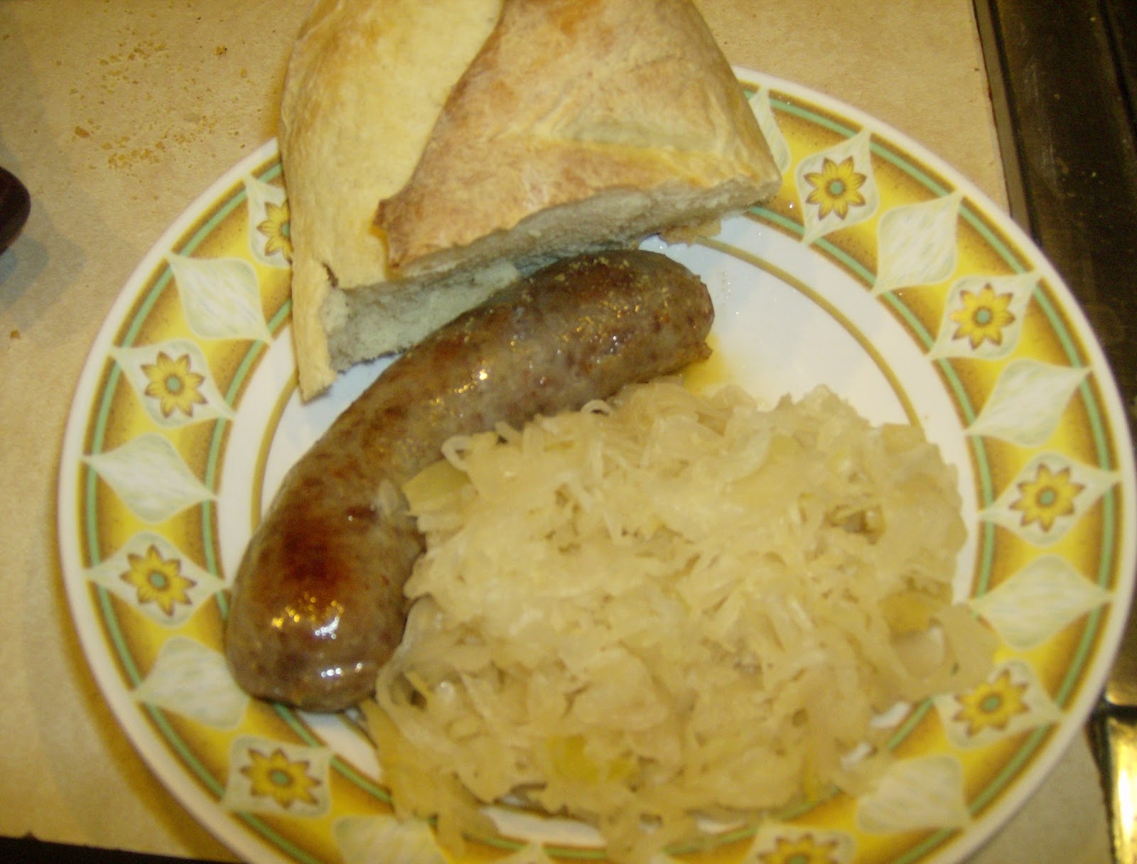 What was for dinner with the French bread? Bratwurst and sauerkraut! Yummy and women are supposed to eat lots of sauerkraut and other cabbage dishes, so it worked out great for me.