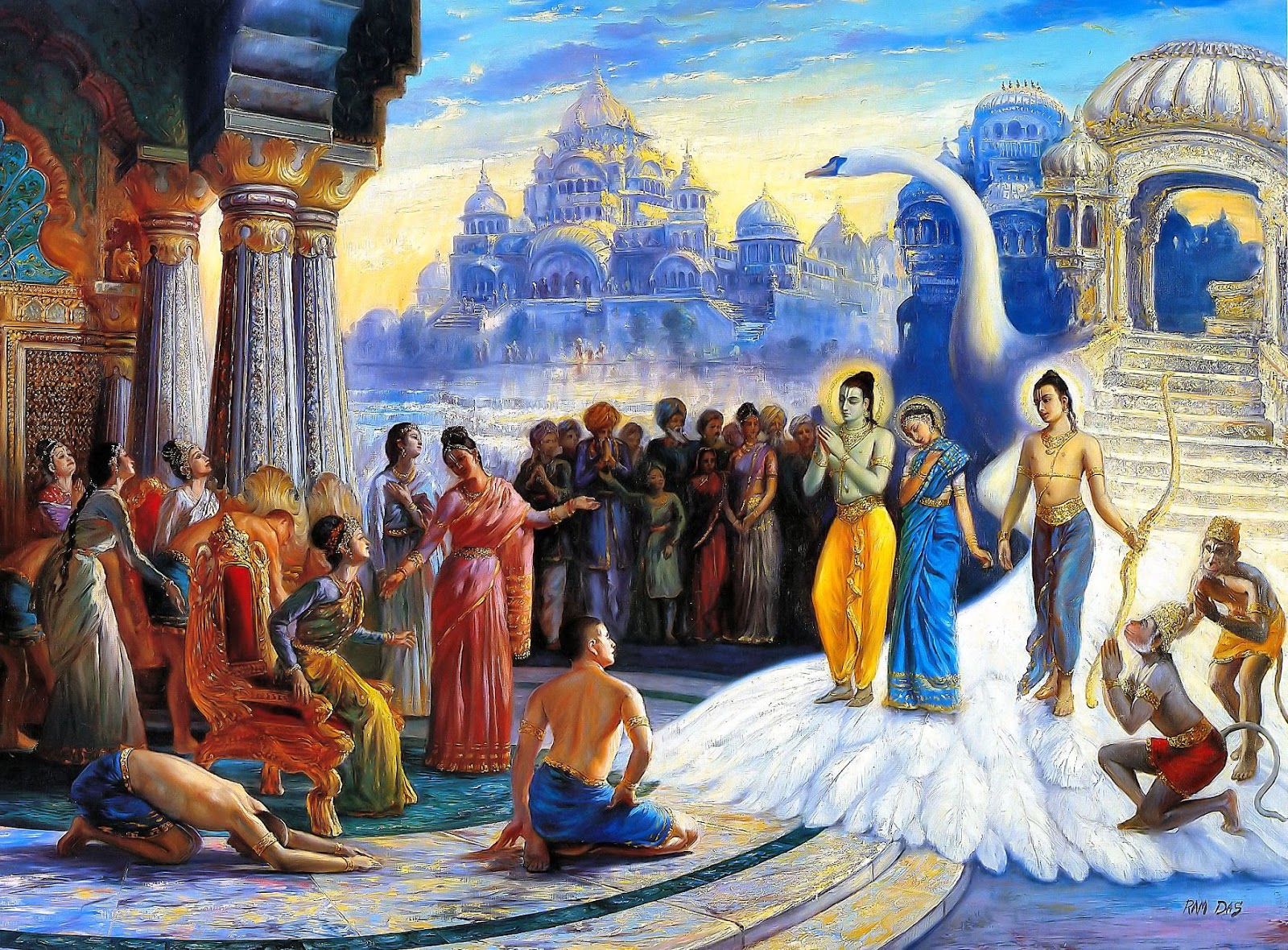 Feeling greatly rejoiced and satisfied while travelling in that splendid aerial car, which was now in the air and was provided with the image of a swan, Rama shone like Kuber.