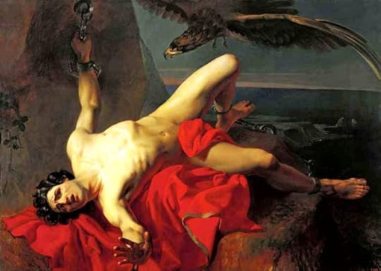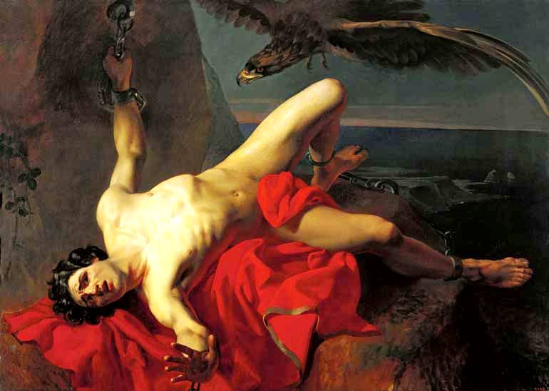 This reminds me of the Greek myth of Prometheus where fire was stolen from the King of Gods Zeus and given to Man. As a punishment, Zeus chained the Titan to a rock on the Caucasus mountains where the giant eagle Ethon would eat at his Liver everyday!