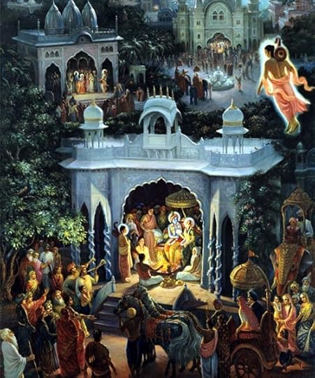And on this sunlike, divine, wonderful chariot the wise disciple of Kuru flew joyously upward. When becoming invisible to the mortals who walk the earth, he saw wondrous airborne chariots by the thousands.