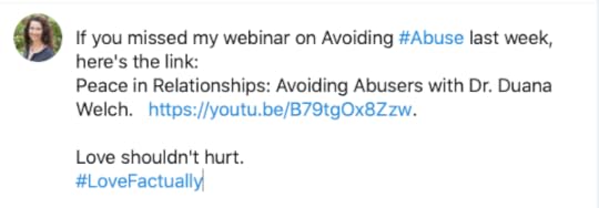 If you missed my webinar on Avoiding #Abuse last week, here’s the link:Peace in Relationships: Avoiding Abusers with Dr. Duana Welch. https://youtu.be/B79tgOx8Zzw.