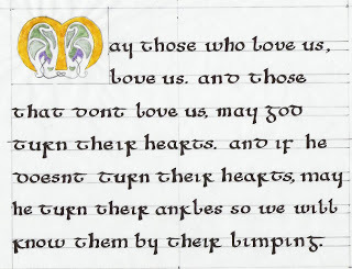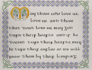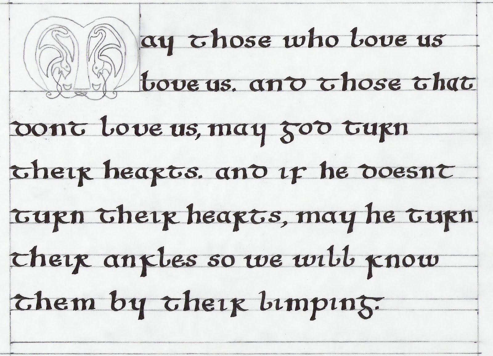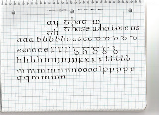 When I have "down time" I do calligraphy. It occurred to me there are parallels between calligraphy and our writing. Believe it or not, the finished product doesn't magically appear. Just as we spend hours working on our writing, polishing and refining it, the calligrapher also spends hours--much of it in preparation before he or she leaps out with the touch of faith to put pen to paper. As with almost anything we attempt, we start with practice. Repetition and constant practice leads to competency at the very least.
