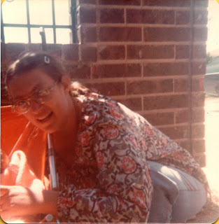 Found this photo of me at twenty-eight and I stopped to marvel at my ability to squat down next to my youngest child of four in her stroller (you can't really see her, but she's there). Based on clothing, etc., I imagine this was taken in the fall of 1978... a little while ago. I can't imagine getting into that position now.My knees pop when I bend. My hip joints protest in no uncertain terms. Nah... I don't get down like that anymore unless I'm in a swimming pool.