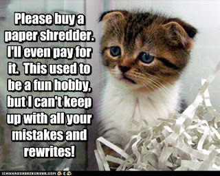 Now where was I going with this thought...oh, yeah. Rewrites. I confess I just don't get the idea of rewrites--in general. I'm not talking about gentle tweaks here and there. (See definition above.) It's the massive revisions some authors mention/complain about. Working on fifth round rewrites...should be done with this round in three weeks.