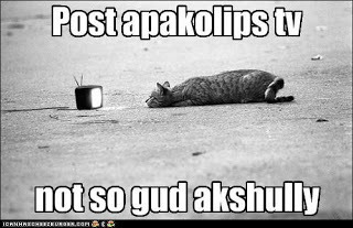 Post apocalypse... I've been working on a story, a post apocalypse-after the plague story. It's hard to decide what will be around after the apocalypse. Or rather, it's hard to convey that without spending a lot of time saying, "That's not available anymore." Well...not actually using those words.But if there's no one to run the factories, no one to keep the water, power, refineries running, and no one to drive the food/supplies to the stores... Then, what will the world be like? I figure it will pretty much resemble early colonial America except we no longer have the necessary skills to survive.