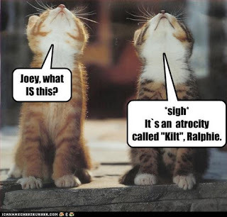 Personally, I don't really care for the "modern" kilt--the one men wear for formal events. It's just too buttoned down. I can't imagine them fighting or doing much of anything very exciting in that prim little skirt. Now, the "great kilt"--the original, yep. That's the one worn in movies like Braveheart. That's the romantic kilt. Apparently, it's mostly a myth, unfortunately. :-(