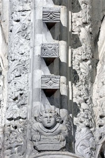 ASSOCIATED PRESS- The stone carved angel, bottom, and cubes that lead a team of code-breakers to claim to have found music hidden for 500 years in the intricate carvings, are seen at Rosslyn Chapel, in the village of Roslin, near Edinburgh, Scotland Wednesday May 2, 2007. Father and son team Thomas and Stuart Mitchell say they deciphered a musical code hewn into stone cubes on the ribs supporting the ceiling of Rosslyn Chapel. The music has been recorded, and will get its official premiere in the chapel May 18. Rosslyn Chapel is where author Dan Brown set the climax of the best-selling book 'The Da Vinci Code.' (AP Photo/Gordon Frazer)