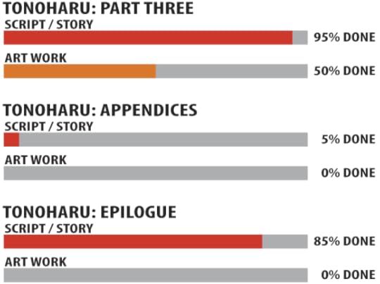 Just to end this on a slightly more positive note: like I mentioned before, the second printing of Tonoharu: Part One is all but sold out. (Personally I only have SIX signed copies left, and amazon.com is showing they have less than ten left.) I’m currently prepping a 3rd printing. I figure the hardcover has run its course, so I’m going to do a cheaper paperback with a redesigned cover. Who knows, maybe that’ll drum up sales. Also, in case there’s any doubt, I WILL finish Tonoharu, come what may. Maybe it’s just my natural stubbornness, but nothing will make me abandon the project. It’ll be a while yet, but it will get finished and released. So hey, that’s something.