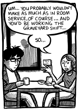 If sales were great (ten of thousands) I would seriously look into switching to a half-time job (as opposed to the full time day job I work now), so I could devote more time to cartooning.