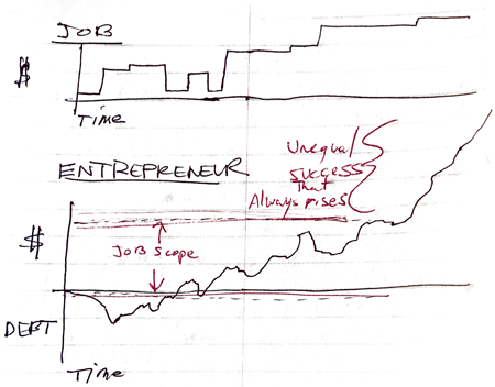 I’ve sketched out money over time for an employee vs. an entrepreneur with differences below.