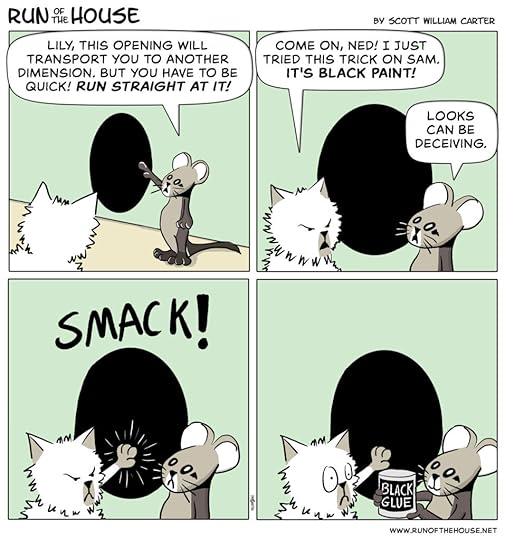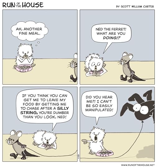 I’ve been in a productive grove lately. Some of this stems from staying off-line until the evening most days, but a lot of it is just being more focused and efficient, channeling my energy into what yields me the best returns. I like to split my productive time 70/30 between the writing and cartooning, with the writing getting the bulk of my efforts, and I’ve been edging closer to that ideal. The Run of the House cartoon strip is a completely different ball of wax from my fiction, especially my crime fiction, but doing it provides me with a nice change of pace. One of my fans described the strip as “frequently funny, often profound, and sometimes just plain weird,” which I thought was the best summation of my quirky sense of humor I’d ever heard! And a good tagline!