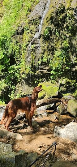 Not that it’s raining now! The weather has been spectacular as of late, which is pretty much the norm this time of year in the Willamette Valley. These are the months when I couldn’t even imagine living anywhere else. I once told a waiter in Istanbul (now there’s a way start to a sentence) that God created the Earth in six days, and on the seventh day . . . he realized he hadn’t got it quite right, so he created Oregon. I was only partly joking. I love this place. I’m not the only one either. Here’s a shot of Rosie on a recent hike at Pheasant Creek Falls: