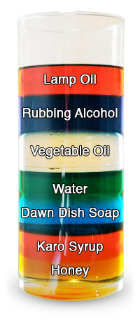 · A tall, thin glass cylinder. This can be aflower vase, a graduated cylinder, or simply a tall glass. · A turkey baster· Honey· Karo syrup· Maple syrup· Dawn dish soap (important as this is a knowndensity)· Water –colored with food coloring· Vegetable oil· Rubbing alcohol – colored with food coloring.· Lamp oil· (An optional addition is milk, which we didn'tuse. We thought it might get gross.)