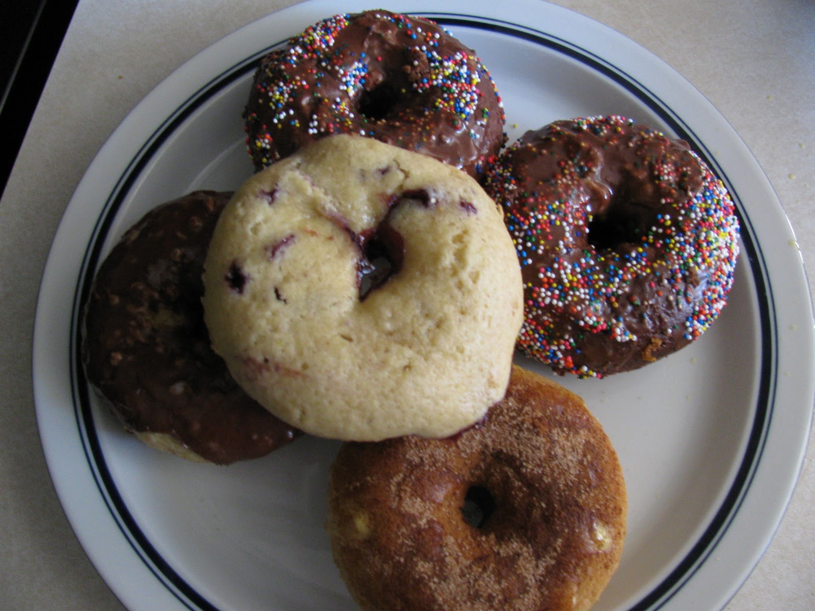 *** We made a chocolate glaze with cocoa power and confectioner's sugar and a bit of water. We added sprinkles to those. We also brushed a couple with butter and sprinkled cinnamon sugar over them. Finally we tried jelly-filled, which worked pretty well. Although I'd put a sheet pan under the pan to catch any runaway jelly. For these we put in half the batter, added about 2T of jelly, then topped with the remaining batter.
