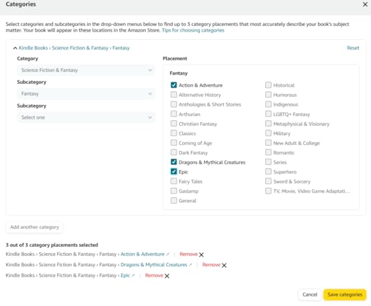 For the keywords, think of words or phrases that describe your book that you think someone searching for your book might enter into a search engine. For example, if I’m a reader interested in an adventurous tale with dragons, and you just happened to have written a story with adventure and dragons, then enter those keywords or phrases. You only get seven, so choose wisely!