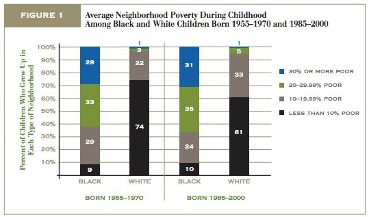 ….racial differences in neighborhood exposure to poverty are so strong that even high-income blacks are exposed to greater neighborhood poverty than low-income whites. For example, nonpoor blacks in Chicago live in neighborhoods that are nearly 30 percent in poverty—traditionally the definition of “concentrated poverty” areas—whereas poor whites lives in neighborhoods with 15 percent poverty, about the national average.*
