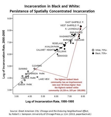 In the chart above, Sampson plotted the the incarceration rate in Chicago from the onset imprisonment boom to its height. As Sampson notes, the incarceration rate in the most afflicted black neighborhood is 40 times worse than the incarceration rate in the most afflicted white neighborhood. But more tellingly for our purposes, incarceration rates for white neighborhoods bunch at the lower end, while incarceration rates for black neighborhoods bunch at the higher end. There is no gradation, nor overlap between the two. It is almost as if, from the perspective of mass incarceration, black and white people—regardless of neighborhood—inhabit two “fundamentally distinct”worlds.
