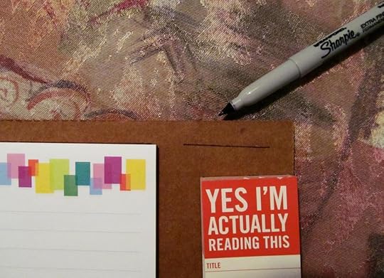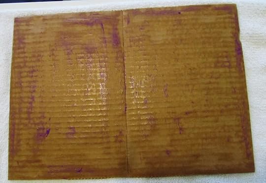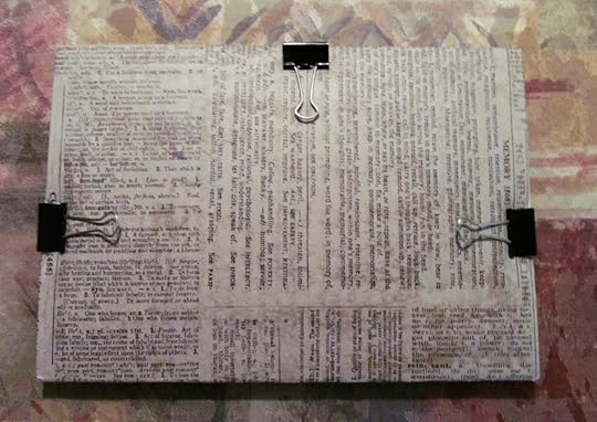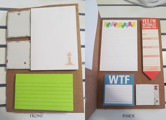 The first time I tried this I put the note pads on both sides inside the cardboard piece to make it more like a book, but that turned out to be a bit bulky and hard to keep closed. I thought about refolding the carboard, but decided to put half the note pads on the outside and half on the inside, and that worked better for me.