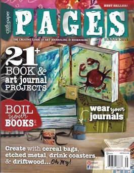 Can you turn driftwood, two by fours, cereal bags and coasters into journals? If you get the third issue of Pages magazine you can; those are just a few of the projects included in this Summer 2013 edition. There are also two articles on how to make journals you can wear on necklaces which look like fun; I'm definitely going to try my hand at both.Over the last couple of years the evolution of journal-making as an art form has been fascinating to follow. Mixed media artists are bringing new materials, techniques and perspectives to the craft that are entirely unexpected, and taking the journal in all sorts of new directions. Pages does a great job in sampling some of the most interesting of these as well as presenting ideas I've seen nowhere else. As with previous issues the mag offers multiple projects with detailed instructions for bookmaking, covers and binding, inside pages and the art of journaling, and as always there are plenty of ways you can repurpose and upcycle materials to keep your projects green.