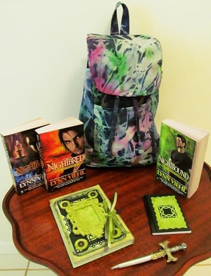 Stop by if you get a chance, join the discussion, enter the giveaway and you could win this lovely backpack filled with a complete signed set of the Lords of the Darkyn trilogy (Nightborn, Nightbred and Nightbound), a custom-made journal and matching memo book from one of my favorite Etsy journal makers, and a nifty sword pen.
