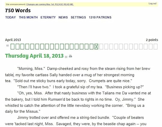 750words.com is an online writing site that challenges the user to write 750 words per day. You register to create an account, which then takes you to a page where you simply write. Everything you write on 750words is counted and saved, and when you reach your daily goal you're awarded two points and an X in that day's box. Here's a screen shot of one day's page from my account: