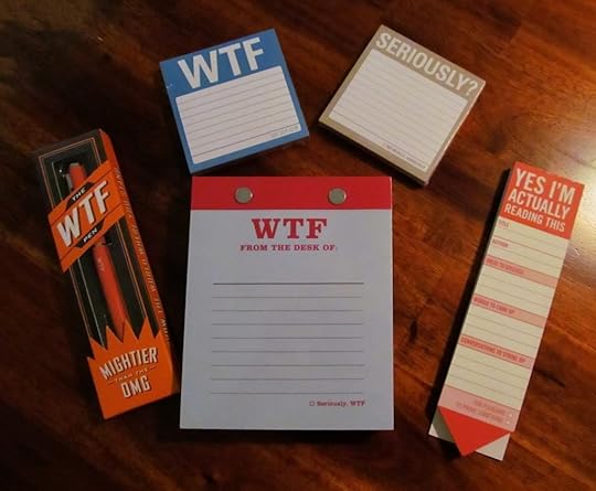 Knock Knock says they put the fun in functional, and this collection of obnoxious office supplies I found at BAM is definitely that: WTF pen, $13.99; WTF and Seriously? sticky notes, $3.99 each; Yes I'm Actually Reading This Bookmark Notes pad, $4.99; large WTF desktop pad, $9.99.