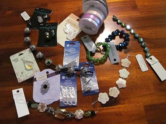 Darice has reasonably-priced strands of glass and shell statement beads that are fun to play with; they range in price from $2.99 to 6.99 depending on the style. Laliberi, which sells a line of metal jewelry-making components, has some interesting connectors that come with jump rings already attached; I picked up a pair regularly priced at $5.99. Blue Moon, one of my favorite bead sources, had some fun metal pendants in pairs and quads at the same sale price, and Plaid's pendant duos were even cheaper, on sale for $2.39. Tori Spelling's Styled jewelry-making line has pieces that are mainly too big for use as anchors, but I found one onyx and crystal piece that I liked for $5.99. I also picked a couple of 1/4" ribbon spools out of a bargain bin at 2 for $1.00. All my savings convinced me to splurge a little on some 15 yard spools of 1/4" silver organdy ribbon for $2.49. All of the above were purchased at my local JoAnn's (and because I shopped during a sale I got everything 40% off.)