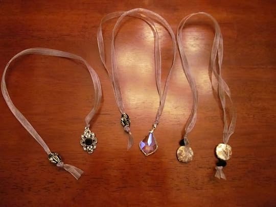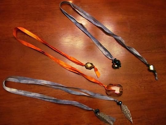 I'm working on another project with hand-dyed silk ribbon, and stole a couple lengths of that to see how it would work as a loop. I'll warn you upfront; once you use real silk ribbon for a BookLoop you'll never want to go back to organdy. It's thin enough to be threaded directly through the beads with a tapestry needle, has almost no weight at all and sings through your fingers like a whisper. Real silk is also sturdy enough to hold the weight of your anchors. The only drawback to using silk ribbon is that it snags easily, so you do have to be careful when you're pulling it through your anchors. Silk does wrinkle like crazy, too, but I actually like the vintage look a little crumpling gives it. The textile artist who dyed my ribbons no longer sells them, but you can make do with any narrow embroidery-type silk.