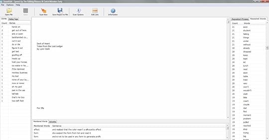 The program finished scanning the novella in about thirty seconds, and gave me several windows of information with different tabs: Cliches and Dialogue Tags in the left window, Repeated Phrases and Repeated Words in the right window, and Monitored Words and Adverbs in the bottom window (to see another, larger screen shot of my file in the program, click here.) Double click on any of the words in any of the lists and the program takes you to the first time you've used it (at which point you can delete the offending phrase and move on to the next instance of use. You do have to delete or change the phrase before you can double-click to move on to the next one.) I also discovered I could save the scan report, open it in Word and print out a copy, which was really handy as the tabbed windows with the info are small and take awhile to scroll.