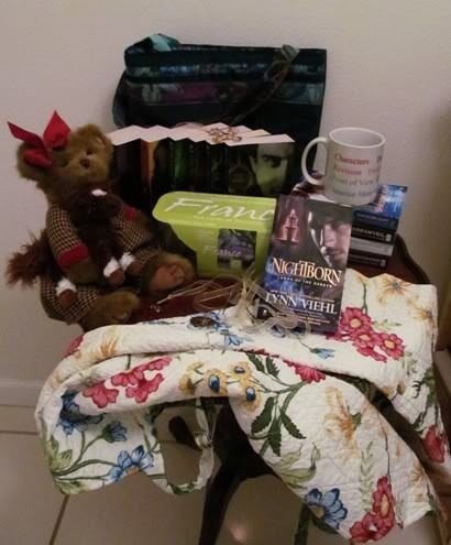 If you'd like a chance to win my wrapup giveaway, in comments to this post name your favorite Darkyn or Kyndred novel (or if you don't have one, just toss your name in the hat) by midnight EST tonight, March 15, 2012. I will draw one name at random from everyone who participates and send the winner signed copies of all seven novels in the original Darkyn series, all four novels in the Kyndred series, and Nightborn, the first novel in my Lords of the Darkyn trilogy. The winner will also receive a beautiful emerald tote bag handmade by murf56dubois, a window garden kit of French herbs to grow, several Darkyn-inspired BookLoops, an adorable stuffed bear and her little toy horse, a writer's words mug from Author Outfitters, and a lovely quilted apron like the one that inspired one particular scene in Nightborn. This giveaway is open to everyone on the planet, even if you've won something here at PBW in the past.