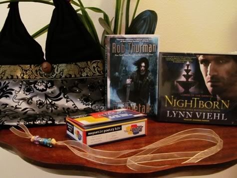 Or you might get one here, along with an audio edition of Nightborn (the first copy just arrived today in the mail, and I'm keeping my promise to do a give away.) In comments to this post, name your favorite audio book (or if you don't have one, just toss your name in the hat) by midnight EST tonight, March 13, 2012. I'll draw one name at random from everyone who participates and send the winner this elegant tote that I also found during my travels, packed with an unsigned copy of Rob Thurman's Doubletake, the audio edition of my novel Nightborn, the Artist's edition of Magnetic Poetry, a scroll edition of my BookLoop and some other goodies. This giveaway is open to everyone on the planet, even if you've won something here at PBW in the past.